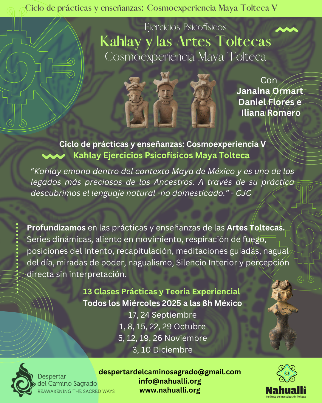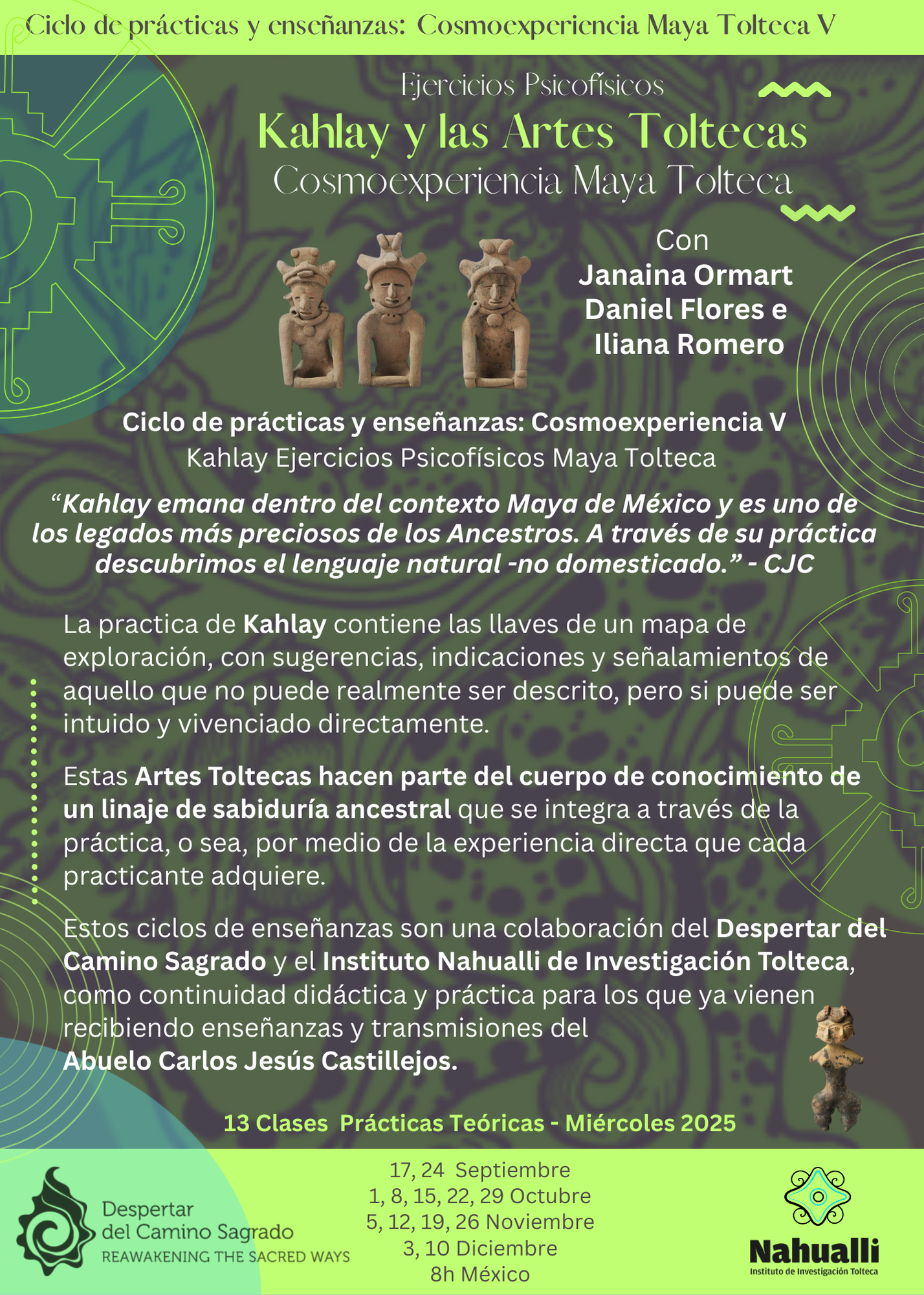 El KAHLAY Maya Tolteca, incluye una serie de movimientos energéticos, pases mágicos, danzas de poder, posiciones estáticas, gestos mágicos y no haceres coordinados a un Intento específico de Reconocer el Flujo Natural y el Estado de Presencia. En la práctica se revelan códigos y llaves de acceso para penetrar en las sensaciones y percepciones del cuerpo físico y sutil. Durante este ciclo vamos a profundizar en la esencia de la práctica de Kahlay, el manejo de energía, del aliento, revisión y mejoría de practicas aprendidas e introducción nuevas Series de Kahlay.