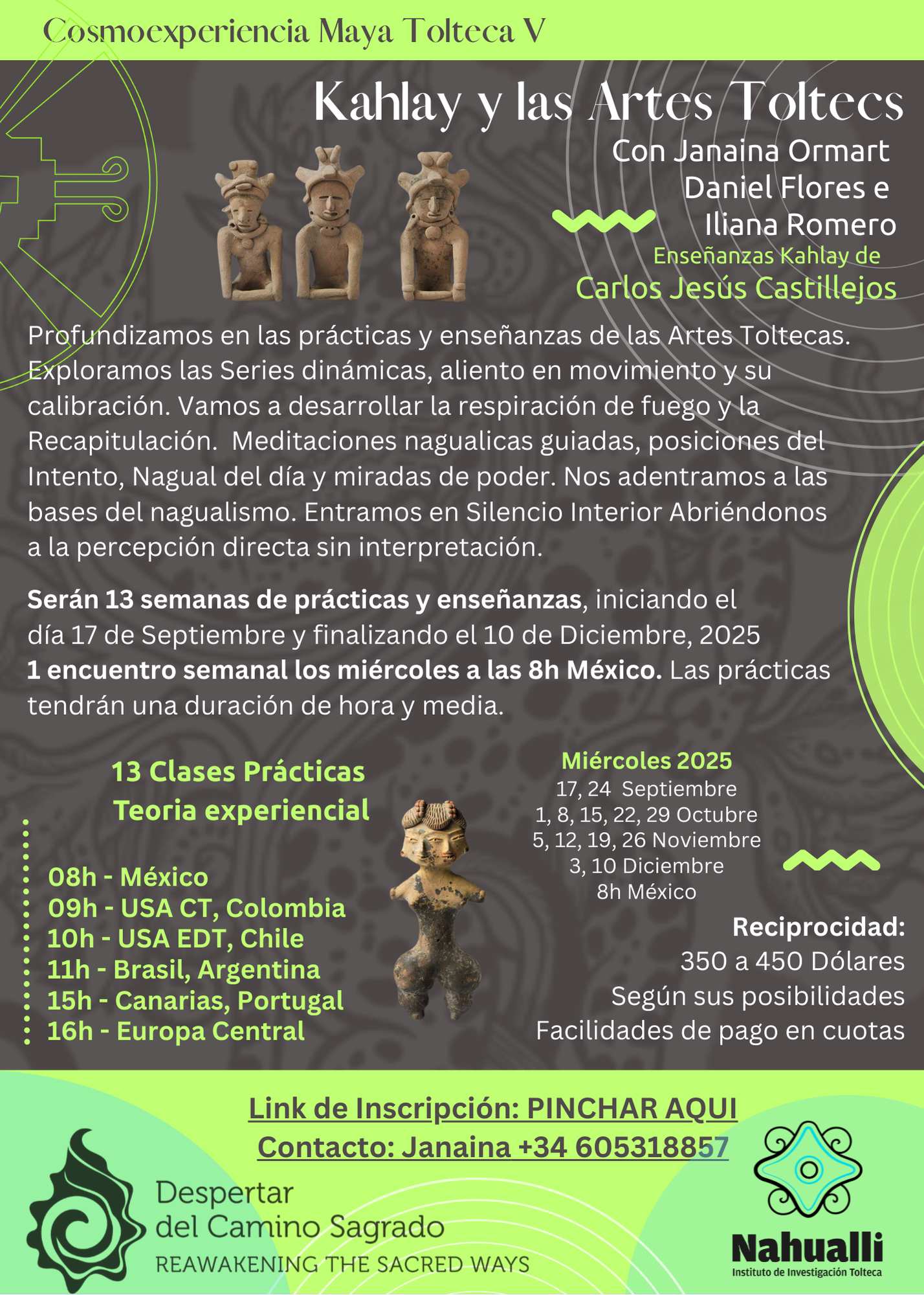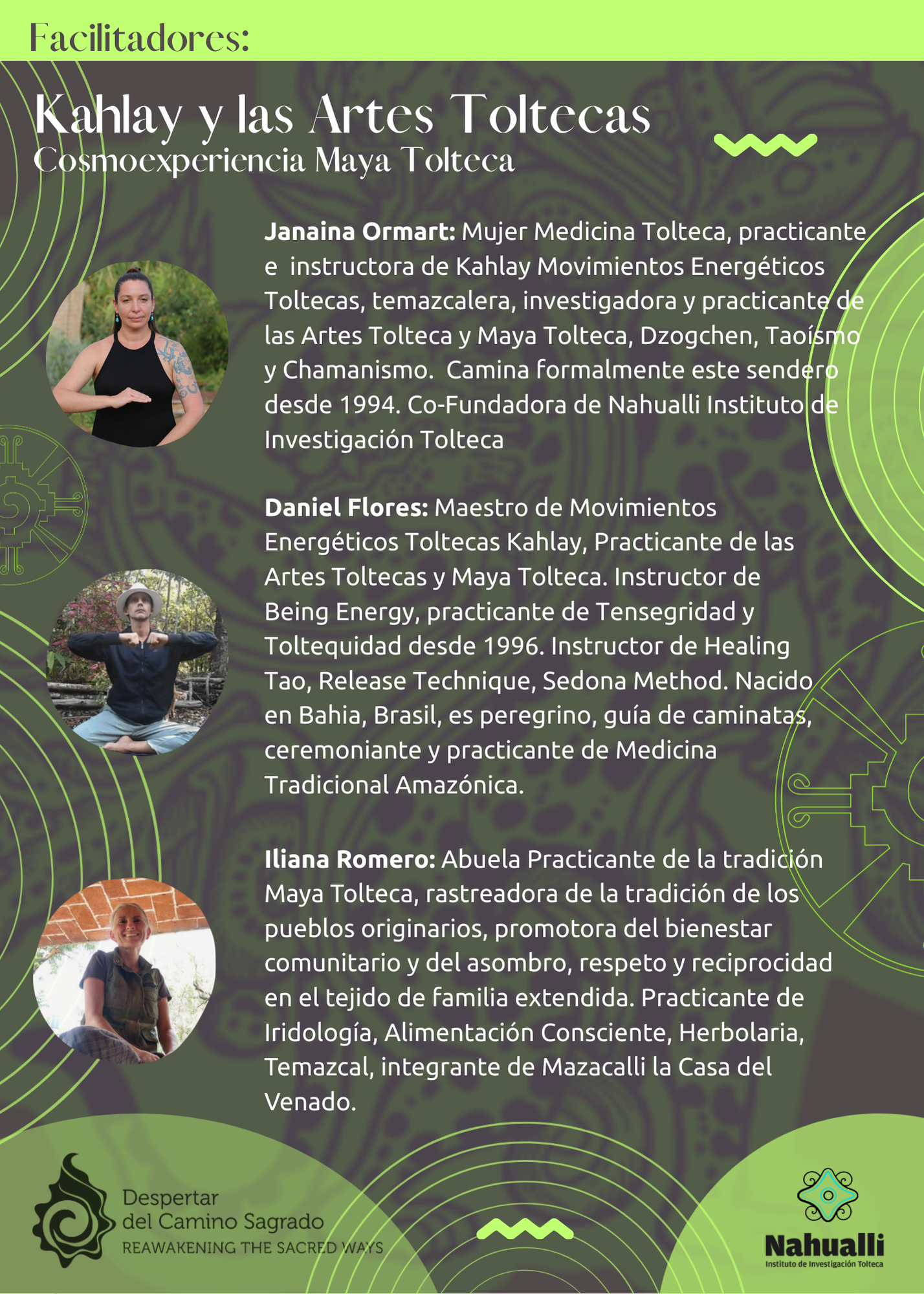Estos ciclos de enseñanzas son una colaboración del Despertar del Camino Sagrado y el Instituto Nahualli de Investigación Tolteca, como continuidad didáctica y práctica para los que ya vienen recibiendo enseñanzas y transmisiones del Abuelo Carlos Jesús Castillejos.