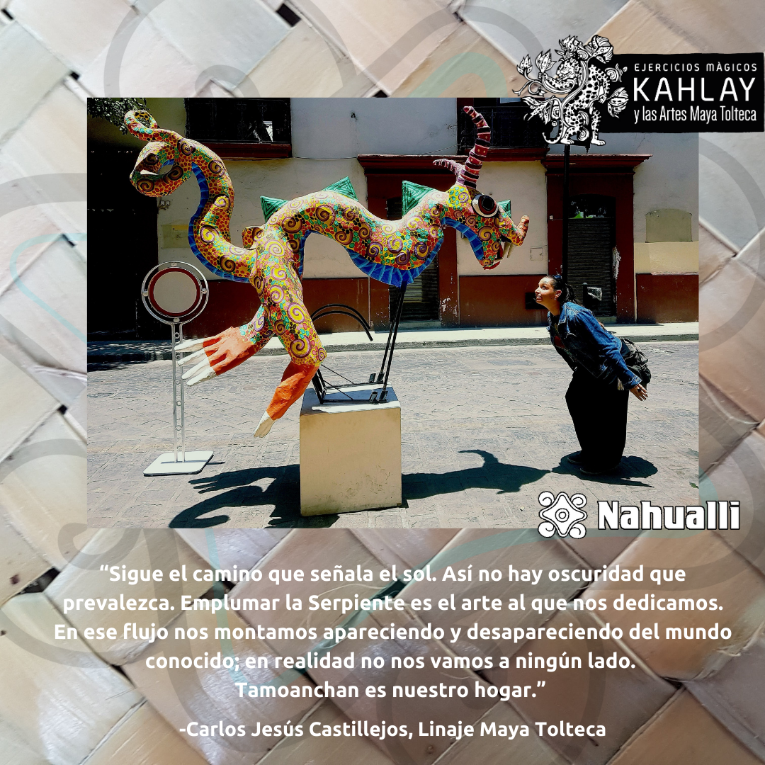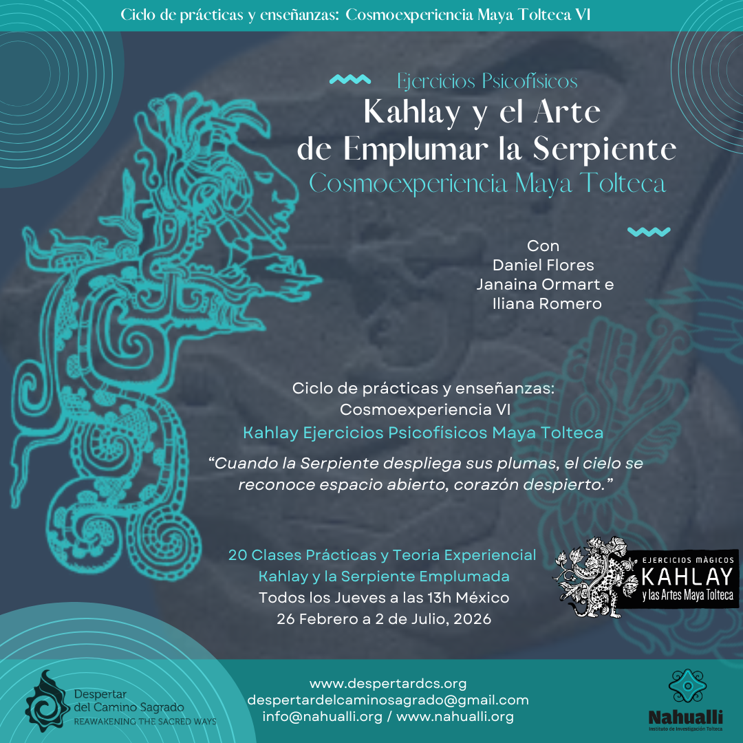 KAHLAY Maya Tolteca: En Maya Yucateco, Kahlay quiere decir Memoria. Dentro del linaje Maya Tolteca, Kahlay se refiere a las Prácticas de Movimientos Psicofísicos que apoyan en el Despertar de la Memoria Ancestral, usando el cuerpo, la intención y el aliento, en series dinámicas y posturas estáticas con el intuito de reconocer el estado de Presencia Aquí y Ahora en cada circunstancia. El Kahlay, además de re-distribuir energía, generar bienestar, vitalidad, foco, equilibrio de cuerpo y mente, nos abre al misterio y a las posibilidades mágicas del ser humano.