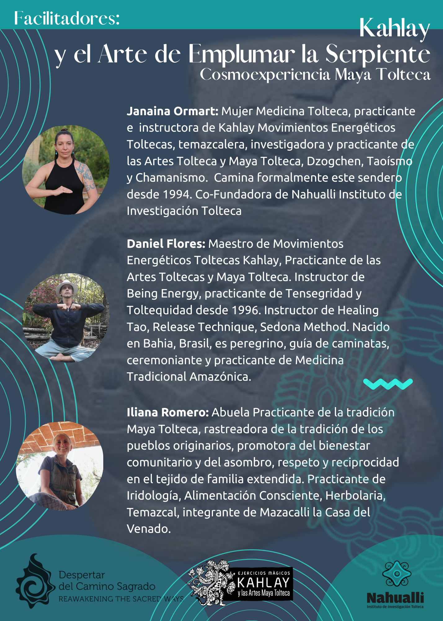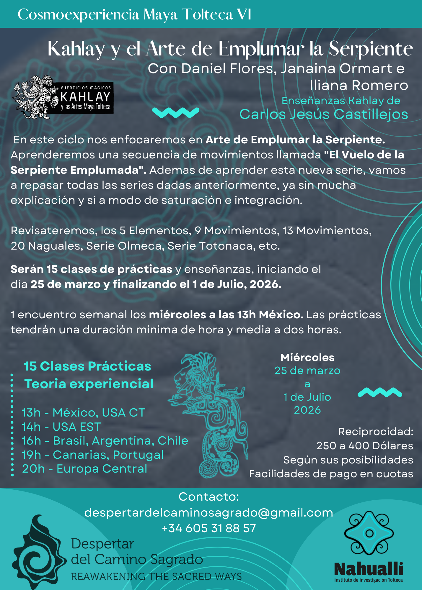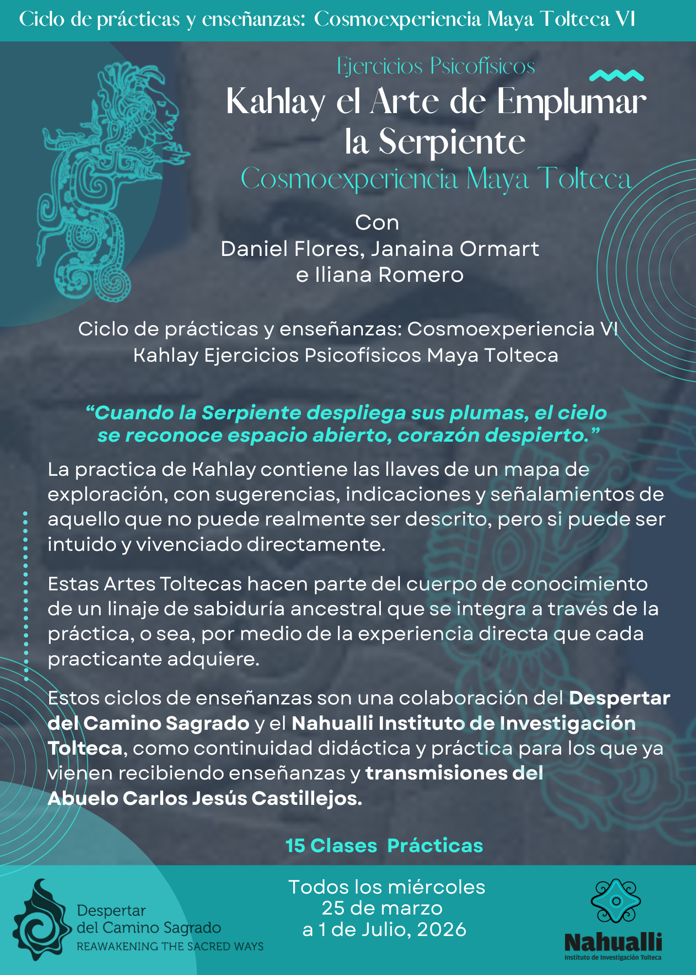 Estos ciclos de enseñanzas son una colaboración del Despertar del Camino Sagrado y el Instituto Nahualli de Investigación Tolteca, como continuidad didáctica y práctica para los que ya vienen recibiendo enseñanzas y transmisiones del Abuelo Carlos Jesús Castillejos.